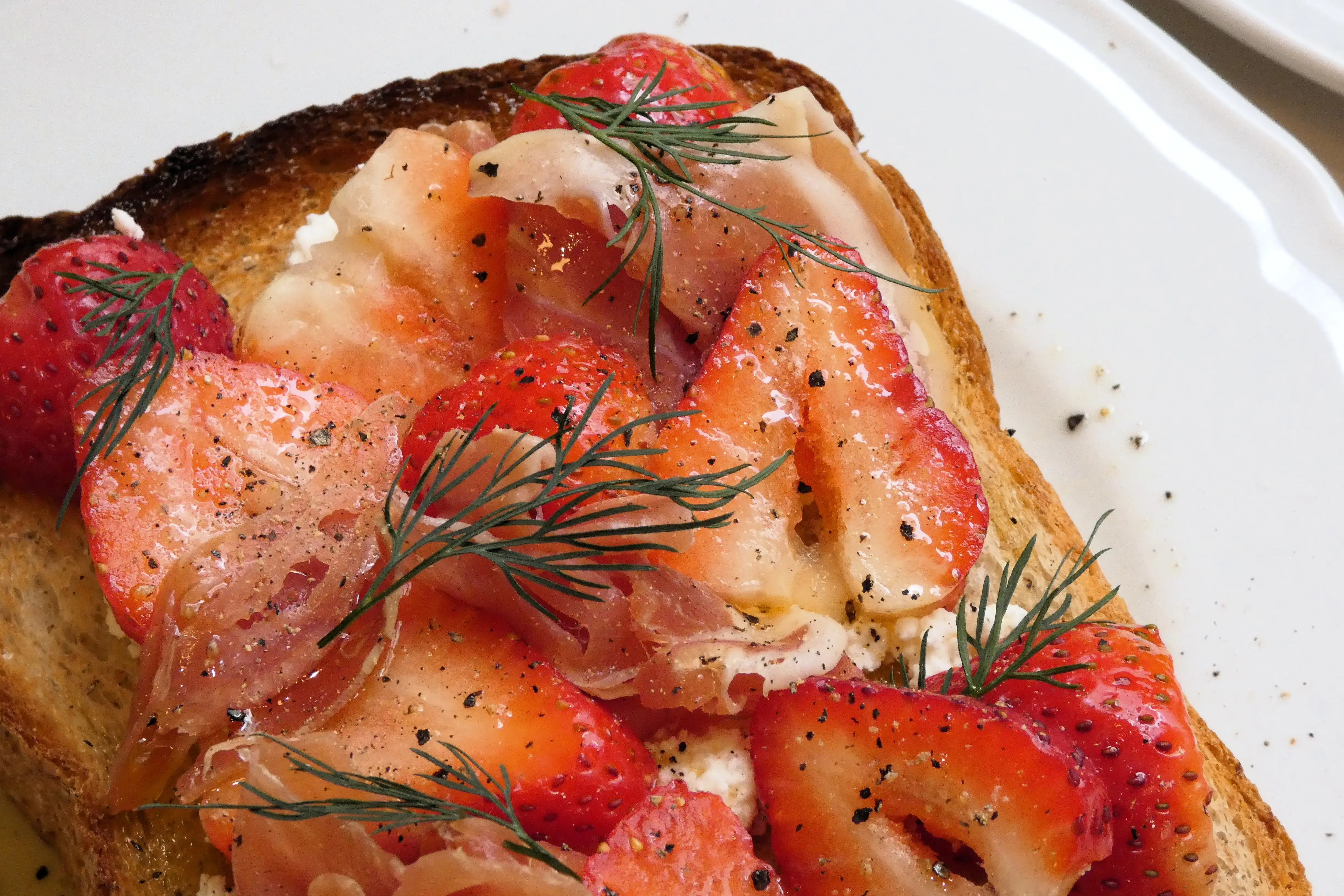 甘酸っぱいフレッシュいちごに、手作りのカッテージチーズ、ハーブ、そして相性抜群の生ハムをのせています。